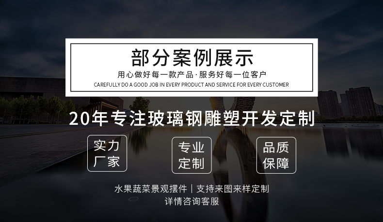 我们喜欢艺术用品,各种艺术水果雕塑,有文化背景的玻璃钢橙子雕塑,水果景观雕塑,果园生态园将展示一些艺术模拟雕塑作为装饰性景观,所以我厂也留下了很多仿真水果模型。如草莓苹果雕塑、葡萄橙子雕塑、榴莲雕塑、芒果荔枝雕塑、西瓜雕塑、各种番茄、白菜、青椒雕塑、各种萝卜雕塑、火龙果樱桃雕塑、各种水果屋雕塑等。它的兴起和发展,是以玻璃钢雕塑为基础的发展。不同的要求和发展特点紧紧抓住市场,为城市增添许多乐趣,使城市生活更上一层楼。